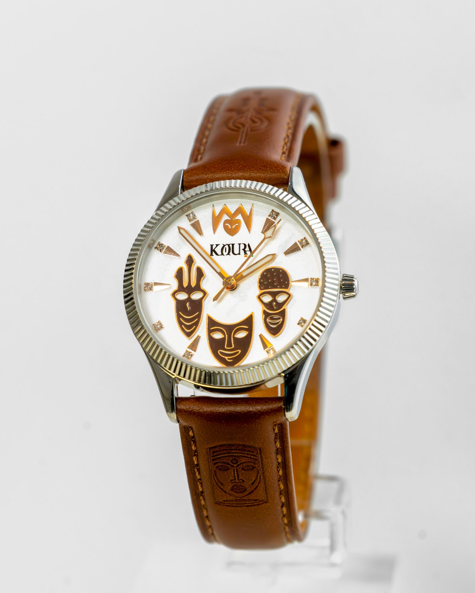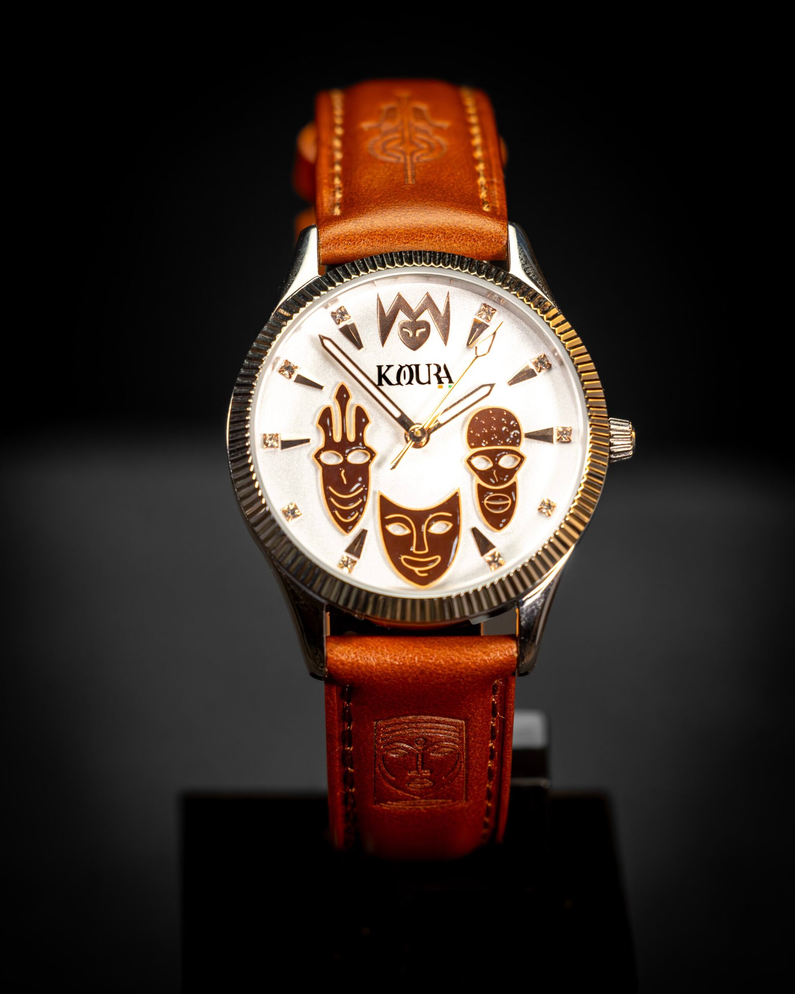 Entre mystère et éclat, le modèle ZAOULI incarne la rencontre entre l’art ancestral et la précision contemporaine. Sculptée dans la noblesse de l’acier et habillée d’un cuir finement gravé, cette montre rend hommage aux masques ivoiriens, gardiens des traditions et témoins des âmes.
